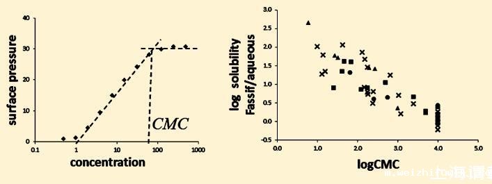 表面张力由一种成熟的体外测定法测定,该测定法通过测量化合物的临界胶束浓度和两亲性来评估化合物的表面活性剂性质。 两亲性是用于量化化合物与生物膜亲和力的一个关键属性,在制药工业中广泛用于预测药物诱导的磷脂病,11,12 − 脑屏障渗透,13和药物淋巴吸收。 14在这项工作中,我们同样评估了化合物对生物相关介质中所含胶束的亲和力是否可以用化合物固有的表面活性剂性质来解释。 因此,我们对不同化合物的表面活性剂性质进行了表征,以将此类表面活性性质与FaSSIF中观察到的与水介质溶解度相比的溶解度增强程度相关联。 共分析了51个分子,包括上市药物和罗氏专利化合物,具有广泛的溶解性、亲脂性和电离状态。
