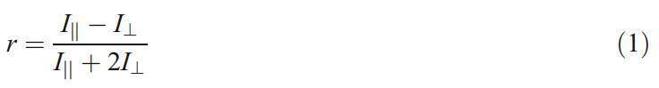 使用荧光偏振仪系统(Beacon 2000)在25.0±0.2°C下进行所有荧光各向异性测量。RB用作荧光探针,其浓度保持在0.1µM。分别使用570和630 nm的激发和发射波长测量荧光各向异性。当发射偏振器平行或垂直于偏振激发方向时,每个荧光强度称为I||或I┴,分别地各向异性是强度差(I||-I)的比率┴)总强度(I||+2I)┴)如等式1[24,25]所示: