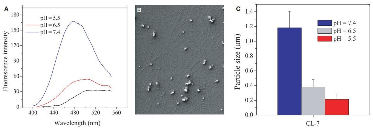 图6:(A)pH值影响不同pH值下溶液(40 lM)中CL-7的聚集。1-苯胺基萘-8-磺酸(1,8-ANS)浓度固定在20 lM,激发波长设置为369 nm。肽聚集溶解通过1,8-ANS发射峰在500 nm处的红移和荧光强度降低来指示;(B)pH=7.4的40 lM肽溶液中形成的CL-7聚集体的扫描电子显微镜图像;(C)隔夜培养后测量溶液中肽CL-7(80 lM)的粒径。数据代表至少三个独立测试的平均值和标准差。