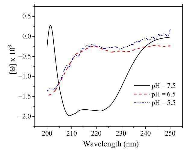图7:pHs影响肽CL-7在20mM NaAc溶液中测得的圆二色谱光谱变化。以1.0 nm的间隔从250至190 nm收集数据,每个波长的积分时间为2秒。对五到十次扫描进行平均、平滑、背景减去,并转换为平均残余摩尔椭圆度(h)[度数/(cm2 dmol?1)]。