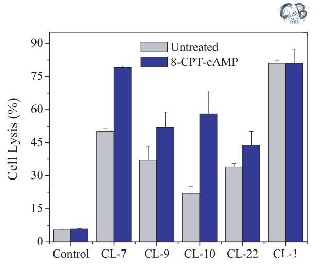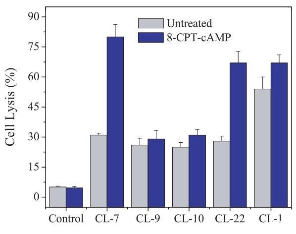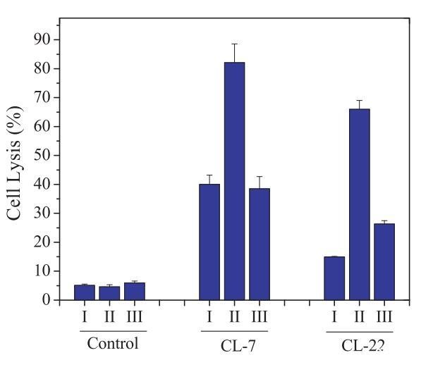图4:在CHO-K1细胞(I)、用8-CPT-cAMP处理的CHO-K1细胞(II)和用8-CPT-cAMP处理的CHO-K1细胞上测试的细胞表面pHs调节PH敏感裂解肽CL-7和CL-22的细胞裂解活性,然后是巴丝霉素A1(III)。表3提供了不同处理对应的细胞表面pHs。在所有实验中,肽浓度固定在40 lM。对照组未添加肽。对照空白对照组和100%裂解对照组,将细胞裂解(乳酸脱氢酶释放)标准化为细胞死亡百分比。数据代表至少三个独立测试的平均值和标准差。