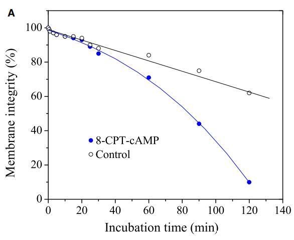 肽与细胞膜的相互作用包括三个步骤:(i)阳离子肽对细胞表面的静电吸引;(ii)肽向结合平面的转变;(iii)将肽插入细胞膜。通过研究pH敏感肽CL-7诱导的膜损伤动力学,研究了肽-细胞相互作用的细节(图5A)。CL-7诱导的A549细胞膜渗漏呈时间依赖性,并呈线性曲线。尽管在8-CPT-cAMP处理的A549细胞上,CL-7介导的细胞膜损伤在开始时遵循相同的曲线,但它偏离了线性曲线,并在培养15-20分钟后加速(图5A)。在脂质单层膜上进行的平行膜张力研究表明,CL-7与细胞膜的相互作用以表面张力快速增加的初始阶段为特征,随后是表面张力松弛的第二阶段(图5B),与肽与膜结合和肽插入相关膜,分别。尽管CL-7与脂膜结合是一个快速过程(3-5分钟),但肽插入脂膜大约需要20分钟才能完成。这两个实验的结果非常吻合,这意味着细胞表面pH对CL-7的显着影响发生在肽-细胞相互作用的后期,即肽插入细胞膜。