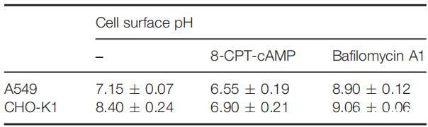 表3:8-CPT-cAMP-和巴非霉素A1在具有生理pH的培养基中诱导的细胞表面pH变化