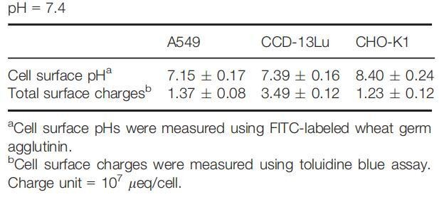 虽然细胞外环境通过影响细胞表面和整体溶液之间的质子交换而影响细胞表面pH值,但在pH值固定的生理条件下,细胞表面pH值将由细胞的化学和生物学特性决定,包括细胞的质子生产能力、细胞大小、细胞的大小、细胞的大小、细胞的大小、细胞的大小、细胞的大小、细胞的大小、细胞的大小、细胞的大小以及细胞的大小,以及细胞表面的pH缓冲能力。因此,在生理条件下,组织细胞可能具有特定的甚至可区分的表面pHs。我们测量了一组来自不同器官/组织的细胞在生理pH下的细胞表面pH值,发现所有受试细胞都具有不同的表面pH值(表1)。