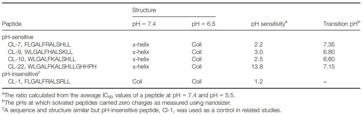 肽CL-1是一种pH不敏感的裂解肽(表2)。尽管其序列和结构与其他pH敏感肽相似,但其细胞裂解活性几乎不受pH的影响。本研究以肽CL-1作为阴性对照。