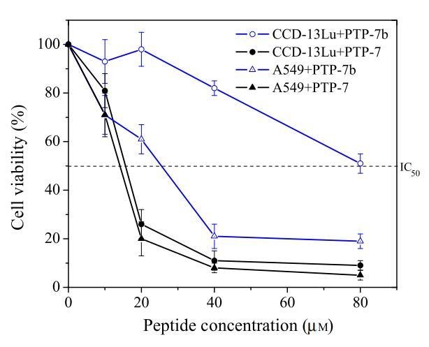 图8:pH敏感肽PTP-7b(FLGALFKALSHLL)对正常-癌细胞对CCD-13Lu和A549细胞的细胞毒性(MTT试验)。以pH不敏感肽PTP-7(FLGALFKALSKLL)作为对照。数据代表至少三个独立测试的平均值和标准差。