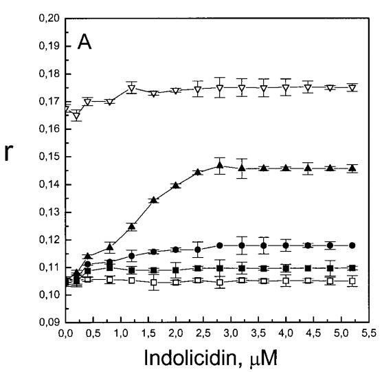 与magainin 2类似,吲哚青霉素与阴离子和两性离子囊泡的膜结合非常不同(图1b、4和5),与先前的平衡透析研究一致(Ladokhin et al.,1997)。虽然芘荧光的猝灭显示吲哚肽被分配到SOPC双层中,但对膜酰基链顺序几乎没有影响(图5)。相反,吲哚西啶与阴离子膜的相互作用导致脂酰链顺序增加,明显表现为DPH荧光各向异性增加,并对XPG呈S形依赖(图5)。与magainin 2相反,吲哚西丁导致芘单体和准分子发射强度显着平行降低,与脂质成分无关,Ie/Im变化较小(图4)。相应地,吲哚西丁诱导酸性PG富集到微区。有趣的是,在吲哚西丁/脂质摩尔比为1:20以下,芘Im的减少顺序为XPG=0.40.20.10(图4a),而在吲哚西丁/脂质摩尔比为1:10时,Im的减少对XPG的依赖性相反。这种变化的可能机制如下。在低肽/脂摩尔比时,吲哚西丁似乎被调节到双层界面(Ladokhin等人,1997),芘标记链的链反转(Holopainen等人,1999)使该部分更接近双层表面,从而允许其与吲哚西丁的基本残基接触。后者通过π-阳离子相互作用导致芘部分的碰撞猝灭。然而,随着XPG的增加,我们可以预期PG头基与吲哚西丁的碱性残基发生静电结合,从而阻止芘与吲哚西丁的阳离子残基之间的直接接触。随着肽浓度的增加,吲哚肽的膜结合以协同方式增强,猝灭效率的逆转可能涉及双分子层中脂肽复合物的聚集。因此,在酸性含磷脂的膜中,吲哚对芘的猝灭作用较小。当吲哚肽的浓度增加到肽/脂比1:10以上时,肽将以高度协同的方式并入膜的酰基链区域(Ha等人,2000)(图9 E),而在中性膜中,肽位于界面(图9 D)。插入吲哚西丁的量取决于双层中的XPG,导致吲哚西丁的Trp残基的猝灭占主导地位,与XPG=0.4时Im的显着减少一致(图4a)。