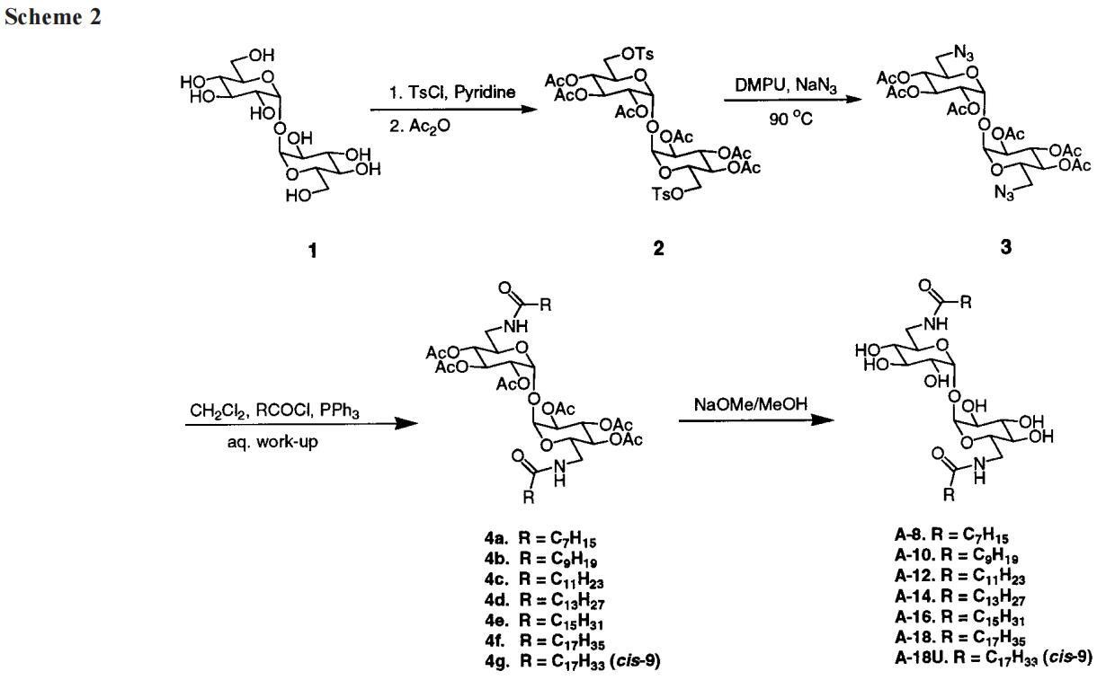 2,3,4,2′,3′,4′-六邻乙酰基-6,6′-二脱氧卡那酰胺-6,6′-二脱氧,r-D-海藻糖,4c。将3(2.0 g,3.2 mmol,6.4 mmol当量)、50 mL CH2Cl2、2.2 mL(9.8 mmol)月桂酰氯和2.20 g(8.4 mmol)PPh3与10 mL CH2Cl2反应。橙黄糖浆的硅胶层析,然后从己烷中进行重结晶(以去除1H NMR检测到的PPh3盐杂质),得到1.08 g(36%)纯4c,mp 64-68°C。