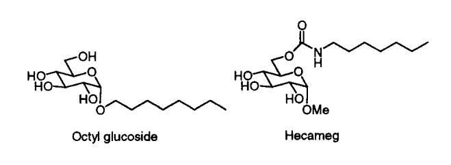 我们的第一个惊喜是发现A系列海藻糖双子座不溶于水。例如,A-12、A-14和A-16(指链长的数字)在1毫升温水中旋转2毫克时会留下沉淀物。即使在70°C的温度下,A-10也会在这种处理过程中形成浑浊的悬浮液。A-8在室温下的可溶浓度仅为1-2 mM(根据动态光散射,在该浓度下,会形成胶束大小的聚集体)。天真地说,人们可能会认为a-8的溶解度大得多,因为该分子由六个羟基和两个酰胺组成。尽管相关的6-氨基-6-脱氧己糖衍生物需要加热才能溶解,25许多烷基化单糖(例如,辛基葡萄糖苷和甲基6-O-(N-庚基羰基)-R-D-吡喃葡萄糖苷或下面的“Hecameg”)是水溶性的。然而,A-8并没有类似的天赋。这里的教训是,用一句老生常谈的话来说,我们的双子座比其各个部分的总和要多(或少)。不管老生常谈与否,双子座的独特属性都取决于它。