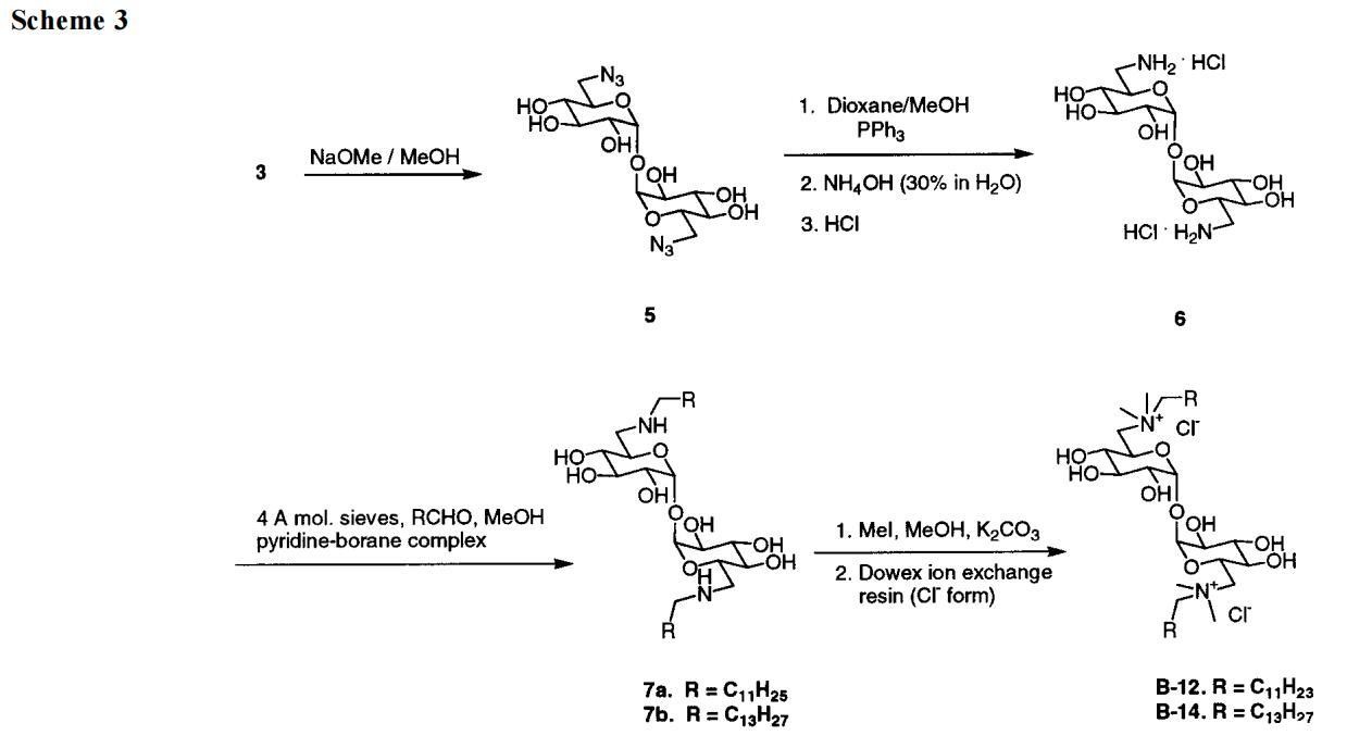 方案2和方案3以及实验部分详述了我们获得A系列和B系列海藻糖双子的方法。另外几条评论有助于美化这一信息。B型海藻糖双子最明显的先验途径是用长链叔胺直接取代2的甲苯磺酰化基团。尽管沿着这些路线进行了多次尝试,但只获得了分解产物或起始材料。然而,如方案2所示,我们成功地用叠氮化合物取代了2的两个甲苯磺酰化物,得到了3。此处采用文献程序28,但出于安全考虑,HMPA被DMPU取代作为溶剂。然后,双叠氮化物3经过Staudinger反应25,29,在一个步骤中得到长链双酰胺4a-g,而该长链双酰胺4a-g只需脱保护即可获得a系列双子。在方案3中,脱保护糖5的叠氮化物还原将化合物转化为二伯胺盐酸盐6。长链醛与6和吡啶硼烷络合物30的还原胺化得到海藻糖衍生物7。使用NaBH3-CN作为还原剂,该反应的产率很低。在用甲基碘化物将7甲基化,然后进行离子交换(以促进纯化和提高溶解性)之后,我们得到了B系列海藻糖双子。