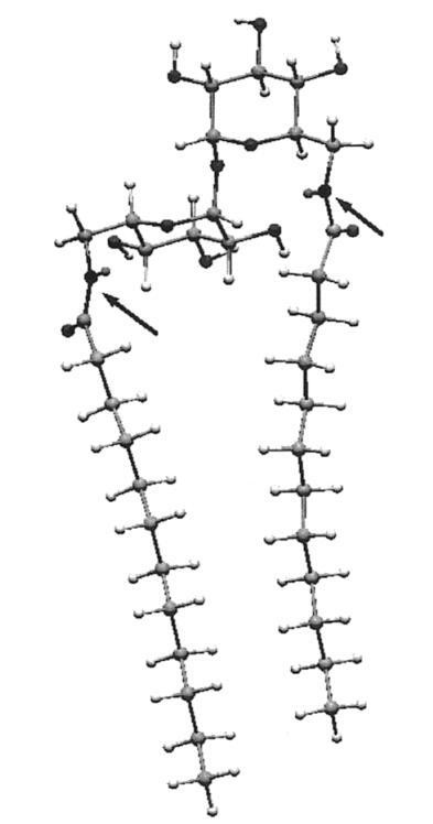 计算首先将海藻糖插入宏模型程序42,并对结构进行琥珀色能量最小化。从使用琥珀色*力场的25000个构象搜索中,我们选择了能量最低的构象,该构象恰好与报告的X射线结构重叠。43,44接下来,该结构中的6-和6′-羟基被乙酰氨基取代。在模拟的水环境中,用AMBER*再次进行了25000次构象搜索。然后乙酰基被十二烷基取代,然后对生成的a-12双子座进行了另一次搜索。结果表明,整个构象由酰胺羰基和相邻葡萄糖环的2-羟基之间的两个分子内氢键控制。氢键导致两条全反式链彼此摆动约95°。A-12的固态红外光谱证实了这种相互作用,该光谱显示1646 cm-1处有羰基带,而Hecameg的羰基带为1700 cm-1,单体葡萄糖类似物的羰基带为1698 cm-1。25由于这种构象会不切实际地排除分子内疏水缔合,而且在任何情况下,羰基氢键位点的溶剂可能会淹没在水中,我们故意不允许-CdO氢键,并重新计算。通过这种方式,我们得到了图6。可以看到,一条链上大约有八个碳与其伙伴链的碳并排排列。N/N距离仅为7.4Å,整体分子形状为“管状”。用另一种方式说,糖的头基延伸的距离不比两条链的宽度大多少,就像人们预期的一种易于堆积成双层的化合物那样。45因此,正如前面从实验数据得出的结论,海藻糖更像是一个统一的头基,而不是一个可以有效隔离链的长间隔基。