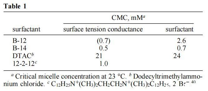 B-12和B-14确实是水溶性化合物,在临界胶束浓度(CMC)以上形成胶束,动态光散射显示颗粒大小小于5nm。CMC值是通过表面张力-浓度曲线(图4)和电导率-浓度曲线(图5)中的断裂来确定的。38表1给出了结果数据(以及两种常规表面活性剂的数据,用于比较)。如图所示,B-12的CMC值通过张力测量法和电导测量法(这两种方法都是可重复的)得出的结果不一致。这种差异至少部分可以追溯到B-12表面张力的时间依赖性。因此,在10分钟的过程中,B-12水溶液的表面压力增加了10 mN/m,之后趋于稳定。这种动态表面张力过程(之前已经用双子座表面活性剂观察到)13,15,39可能与双子座表面活性剂在空气/水界面组织方面的困难有关。为了解决这个问题,图4中的B-12溶液在表面张力测量之前老化20分钟,从而减少了系统尚未平衡的可能性。尽管采取了这种预防措施,但我们无法确定依赖时间的界面重组是否不会影响B-12图,并导致基于张量和电导的数据之间的差异。当然,后者来源于不受界面事件影响的大块特性,因此更可靠。有趣的是,B-14没有表现出随时间变化的表面张力,两种方法确定的CMC值是合理一致的。也许更长的链既增强了对空气/水界面的亲和力,也增强了从溶液中吸收界面的动力学。