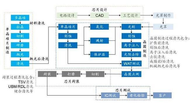 芯片制造技术的进步驱动半导体清洗技术快速发展。在单晶硅片制造中,光刻,刻蚀,沉积等工艺后均设置了清洗工艺,清洗工艺在芯片制造进程中占比最大,随着芯片技术节点不断提升,对晶圆表面污染物的控制要求也越来越高。