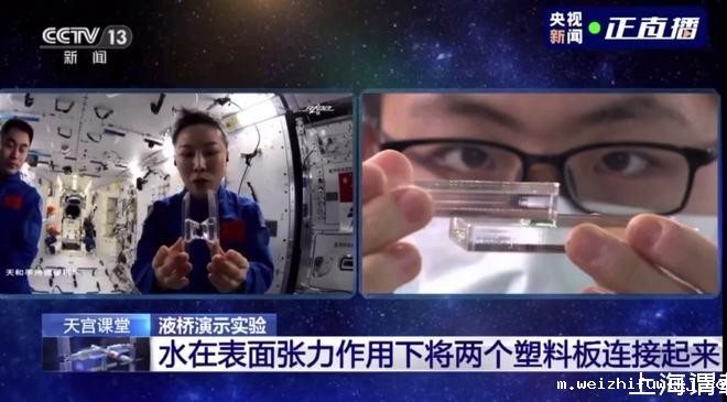 王亚平解释,在地面重力的环境下,水的表面张力微不足道,所以同学们无法用纯水做出一个液桥。而在太空中,由于重力消失,液体表面张力就可以用液体搭建出一座桥。