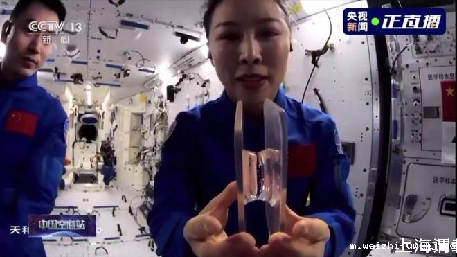 由叶光富将航天员平时所喝的饮用水慢慢倾倒在液桥板上。