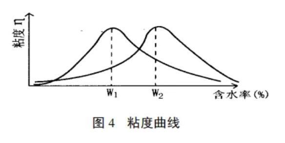 含水量高则流动性好(即每个颗粒表层水膜厚),但凝聚性差,坯体易变形。因此,对每一企业来讲,在原料处理、挤泥机等条件固定的前提下,摸索一个合适的成型含水率,既利于挤泥机成型,又利于砖坯强度。根据我们对几十种黏土的试验数据,每种黏土都有一个最佳含水率,在这种含水率的情况下,黏土的粘性(稠度)最好。典型的粘度曲线(见图4):