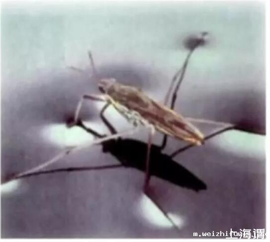 接下来我们看一下,水黾或者绣花针为什么能站在水面上?很显然不是浮力的作用,如果有福利的话,必须要有排开水的体积。