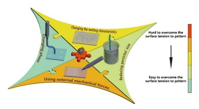 图1克服液态金属表面张力的四种策略及其成型的难易程度