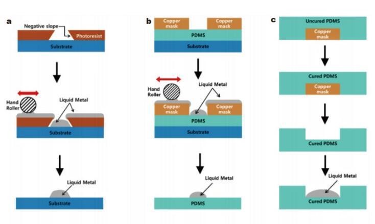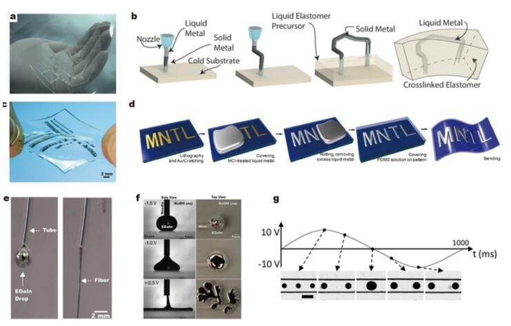 除了某些特定材料的表面(金、铜、锡等)可以润湿外,使用施加电压等方法也可以改变液态金属的润湿特性,使其在基材表面扩散,在此基础上可以制造出可拉伸的电子设备。