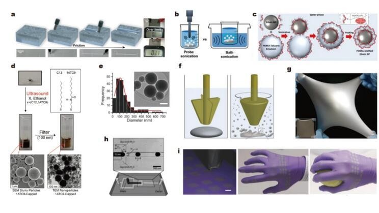使用超声和剪切等自上而下的方法将液态金属从一个大的液滴分割成许多微米级或纳米级的液滴,并保证其粒度分布相对均匀。氧化层或其他人工形成的表面修饰将暂时阻止液滴的重新结合。可拉伸电子设备的图案可以通过排列这些液滴来绘制,这相当于通过减小粒径以增加比表面积(增加氧化层比例)进而降低表面张力。