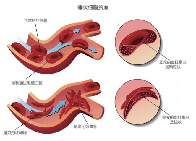 我们的红细胞原本是中间略扁的圆饼形,这下却被又长又硬的突变血红蛋白凝聚物撑成了镰刀形,不但运输氧气的能力大幅下降,还会卡在毛细血管的拐弯处,形成大范围的栓塞,肝脏、脾脏、红骨髓等毛细血管丰富的组织都将受到严重的损伤。所以,那些从父母双方继承的基因都有这个突变的“纯合”患者,常常会有生命危险。