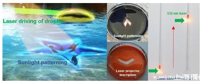 研究中,王志明团队也展示了一些基本应用示例,比如借助激光和日光可以在液体表面雕刻图形,还可让激光搬运液体,让激光驱动毛细管中的液体,让激光驱动液体表面液滴、甚至驱动不同液滴发生化学反应的应用。
