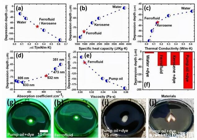 他们发现,液体的厚度、表面张力的温度系数、热导、比热容、吸光性和粘度等物理参数,都会对光致液体形变产生重要影响,尤其是吸光系数和液体的表面张力温度系数。