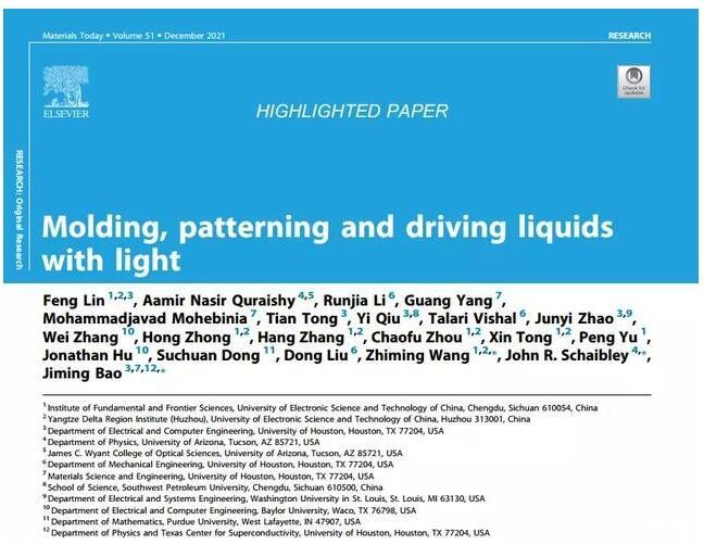 该论文以电子科技大学第一单位发表在国际顶级期刊Materials Today上,并被期刊主编选为Highlighted paper作为亮点工作报道,论文题为《光驱动液体塑模、绘画和运动》(Molding,patterning and driving liquids with light)[1]。