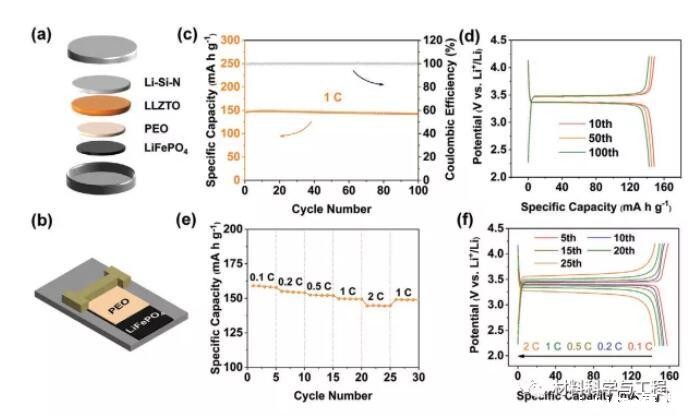 图5.a,b)全固态Li-Si-N|LLZTO|PEO-LiFePO4电池的制备和组装示意图。