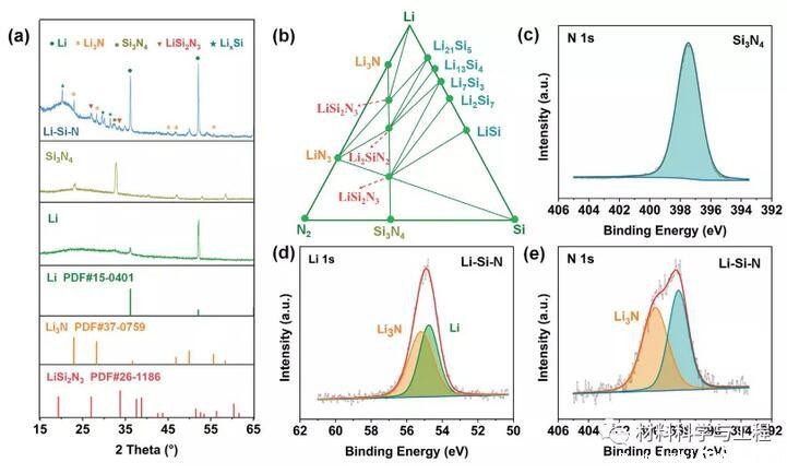 综上所述,本文首次提出了用微量纳米Si3N4(1wt%)调节熔融Li的表面张力来修饰Li|石榴石界面的实验。从Li-Si-N系相图出发,结合XRD和XPS分析,发现当加热1wt%Si3N4和Li金属的混合物时,Li3N、LiSi2N3和LixSi颗粒的形成是一致的,生成的复合材料称为Li-Si-N熔体。Li-Si-N熔体通过两种方式极大地改善了与石榴石的界面接触: