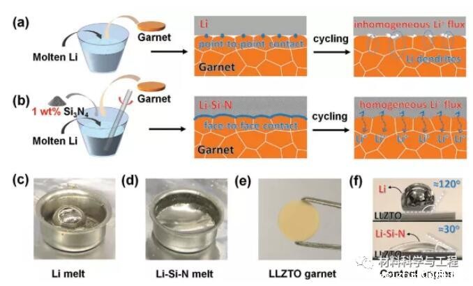 图1.示意图显示了a)纯Li熔体和b)Li-Si-N熔体的制备及其与石榴石颗粒的界面接触行为。