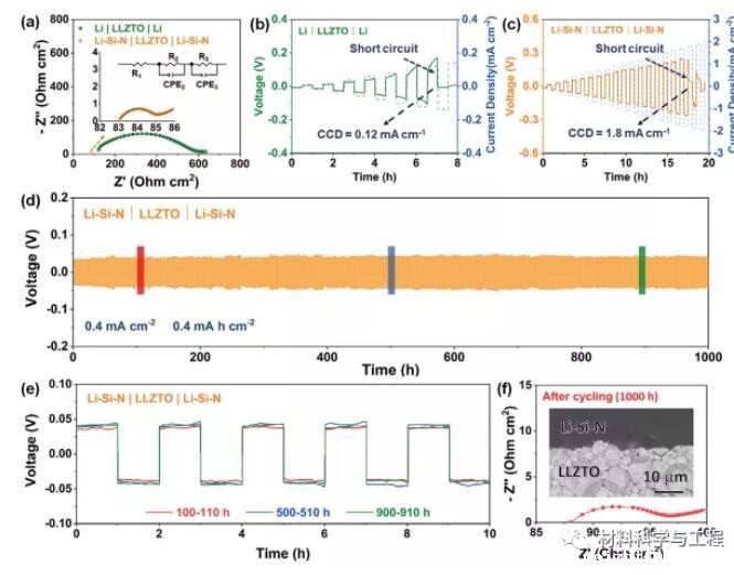 图4.a)室温下Li|LLZTO|Li和Li-Si-N|LLZTO|Li-Si-N电池的交流阻抗谱比较。