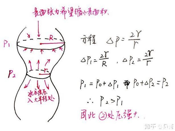 表面张力会像皮筋一样收缩液体的表面积,同时压力大(半径小)的地方的水被挤到半径大的地方,使得本来细的地方半径变得更小。