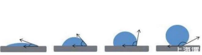 接触角指液体、固体表面、空气三者接触处,弯曲的液面与固体表面所形成的角,如下图所示。