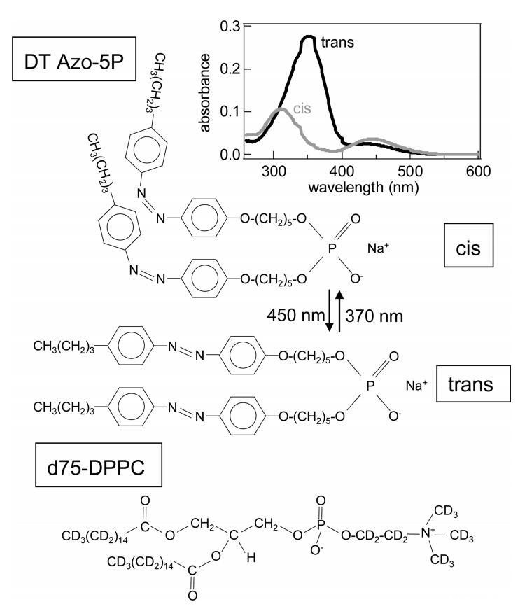 图1:。顺式和反式构型的光开关脂质DT Azo-5P和d75 DPPC的分子结构。右上角的插图显示了CHCl3中DT Azo-5P的紫外/可见光谱(∼在370 nm(顺式)和450 nm(反式)下辐照约10 s后,使用7μM,1 cm反应杯)。