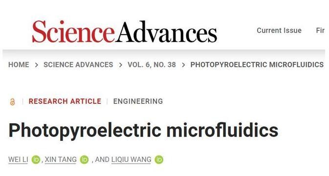 文章链接:W.Li,X.Tang,L.Wang,Photopyroelectric microfluidics.Sci.Adv.6,eabc1693(2020).https://www.science.org/doi/full/10.1126/sciadv.abc1693