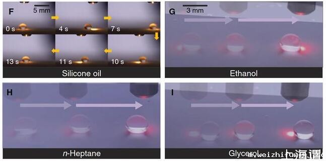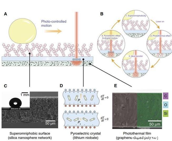 光电微流控平台的设计:微流控平台包括底层的光热薄膜(石墨烯掺杂的PDMS),中间层的热释电晶体(LiNbO3)和上层的超疏液涂层(SiO2纳米空心球分形网络)(图1)。光束可以穿过上层透明的超疏液涂层和热释电晶体照射到底面的光热薄膜,光热薄膜将光能转换成热能使自身温度升高,从而加热上方的热释电晶体在光束照射处产生表面电荷,当电荷引起的介电泳力足以克服液滴在超疏液涂层上的粘附力,液滴则被吸引至光束下方。超疏液涂层不仅为液滴移动创造了极低的阻力,而且避免了液体残留,使得无损液滴操控成为可能,可以对包括硅油、乙醇、正庚烷和甘油在内的30多种液体(表面张力18.9-98.0mN/m)进行无损光控操作。
