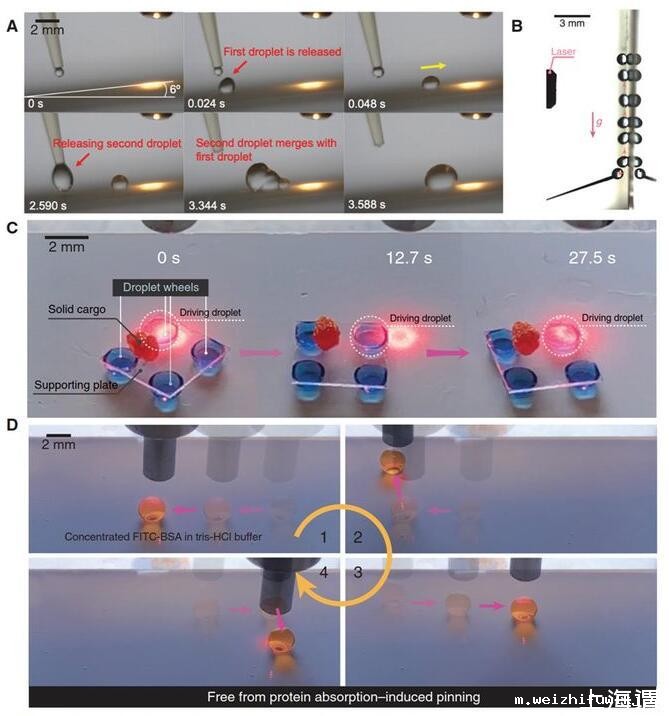 图3.多样化应用。(A)液滴爬坡,(B)液滴反重力垂直爬壁,(C)光控软体机器人,(D)避免蛋白质残留,(E)氨基酸检测.