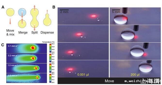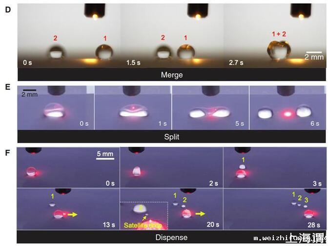 总结:在单束光的作用下,光电微流控平台可以作为一只“魔力”的防润湿的手来移动、切割、融合和分配任意液体,遥控且无损的精确操控液滴不仅在医疗检测和生化分析等领域具有重要意义,而且在软体机器人、3D打印、微流控加工制造等领域具有广阔应用场景。