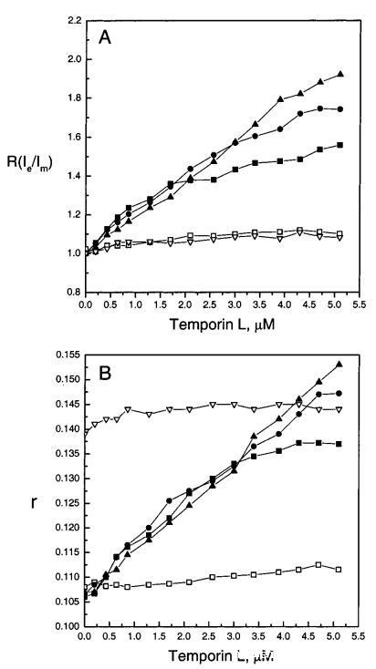 图5:通过芘标记的磷脂PPDPC(X)0.01)的荧光和DPH(X)0.002的稳态发射各向异性r评估颞叶素L对LUV中脂质动力学的影响,显示为含XPOPG)0(0)、0.10(9)、0.20(B)和0.40(2)的SOPC脂质体中归一化准分子与单体比率r(Ie/Im)(图A)和各向异性r(图B)的变化,Xchol)0.10(3)。每个数据点代表三次测量的平均值。标准偏差小于0.02(面板A)和0.004(面板B),为清楚起见,未显示。否则情况如图2图例所示。