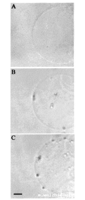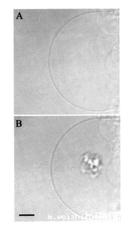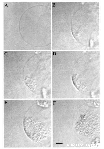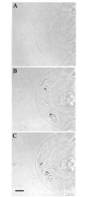 然后我们研究了颞叶素L对巨大脂质体的影响。图7所示的图像序列说明了由于temporin L引起的SOPC巨大脂质体的转化。有趣的是,大约12 amol temporin L(1次注射)已经影响了SOPC膜的外观,在添加肽后1秒内,巨大囊泡内出现聚集结构(图7,面板B)。此外,相邻的巨大囊泡也受到类似囊泡形成的影响(图7,面板B,研究的巨大脂质体下方)。进一步添加temporin L(最多≈0.12 fmol,共10次重复注射)不会诱导进一步的囊泡形成,而两个“内吞”聚集体粘附在肽微注射部位的巨大脂质体表面。大约5分钟后,这两个“内吞”聚集体粘附在一起,在巨大囊泡内形成一个更大的聚集体结构(图7,面板C)。与颞叶素L对SOPC巨脂质体的作用类似,该肽在POPG(XPOPG)0.10存在下诱导类内吞过程,图8)。更具体地说,在添加约12 amol的temporin L(1次注射)后,暴露于肽的巨大脂质体表面的区域变暗,显示折射率的显著变化,并指示形成紧密堆积的三维结构,仅部分保留在焦平面中(图8,面板B)。在内部≈1秒后,巨大脂质体内出现了小颗粒聚集体和暗区(图8,面板C)。同时,还观察到相邻巨大囊泡中的囊泡形成(图8,图B和图C)。随后总共增加了≈24阿米尔的颞叶素L(2次注射)使另一组“内吞”小颗粒出现在巨大脂质体内,与先前形成的聚集体粘附(图8,面板D)。之后≈1分钟,其中一些颗粒(φ≈8µm)从巨大脂质体内的双层释放(数据未显示)。有趣的是,在进一步添加约12 amol的Temporain L(总共3次注射)后,分离的小颗粒再次聚集,暗区的面积增加(图8,面板E)。暗区面积的增加通过添加另一个≈24 amol temporin L(共5次注射)。几分钟后,聚集的“内吞”小颗粒进入巨大囊泡的内腔,而膜表面的暗区消失(图8,面板F)。同时观察到相邻的巨大脂质体的囊泡形成。有趣的是,在胆固醇(Xchol)为0.10的情况下,需要更多的时间蛋白L来诱导囊泡形成(图9)。然而,在添加约0.24 fmol(20次注射)的Tempolin L后,小颗粒的“内吞”聚集物以及≈巨大脂质体内出现直径为9µm的颗粒(图9,面板B)。随后添加≈0.24 fmol的肽(共40次注射)在巨大囊泡内诱导另一组小颗粒,约30秒后与第一个聚集物合并(数据未显示)。然而,随后进一步添加temporin L(高达约1.2 fmol,100次注射)对巨大脂质体膜没有进一步的可见变化。