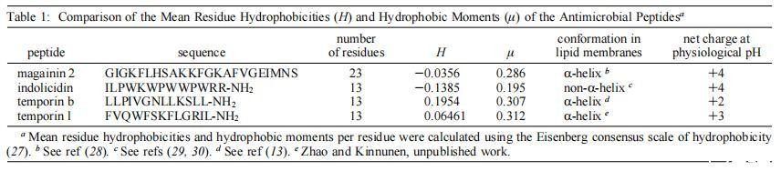 我们的长期目标是建立最低的序列要求,这可以进一步作为设计新型抗菌肽类似物的指导原则。我们之前已经比较了两种抗菌肽,马盖宁2和吲哚肽对本研究中使用的相同模型膜系统的影响,即。,单层、脂质体和巨大囊泡(15)。我们早期研究中使用的肽是选择的,因为它们代表两种不同类型的抗菌肽家族。在本研究中,我们使用了两种13个氨基酸的肽,即与吲哚肽长度相似的肽。肽的结构参数不同,如电荷、构象、疏水性、疏水力矩和大小(表1)。有趣的是,在所研究的四种肽中,以摩尔为基础计算的时间蛋白L最有效,作用于中性和酸性磷脂膜。与其他三种肽相比,其净阳离子电荷和疏水性具有平均值(表1)。然而,在所示的肽中,temporin L具有最高的平均疏水力矩,这表明这可能是与其有效的膜扰动作用相关的一个重要参数,这与之前比较magainin 2和其他抗菌肽的研究一致(31)。