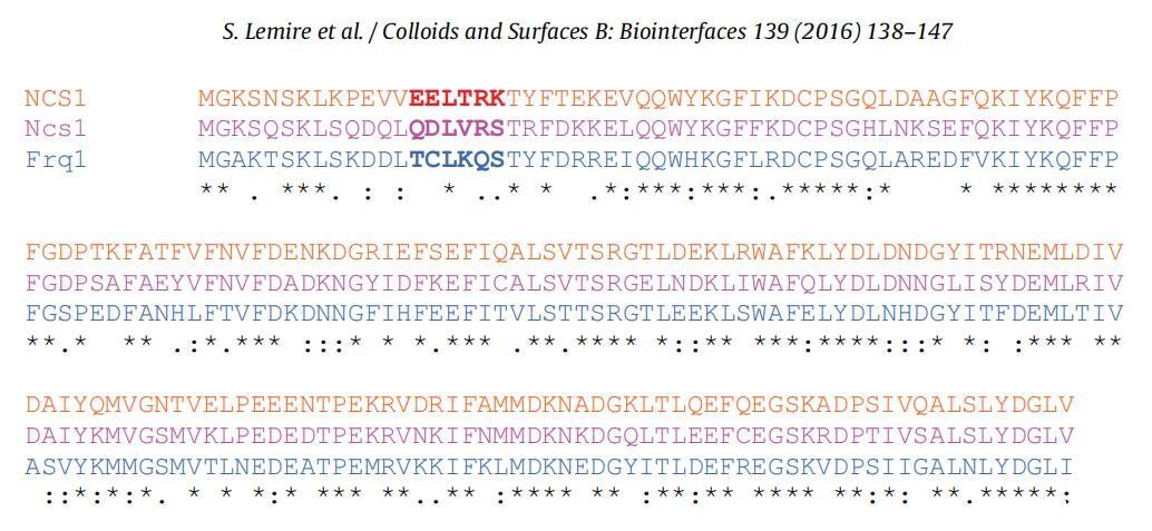 图1.人类NCS1(橙色)、裂变酵母NCS1(粉红色)和芽殖酵母Frq1(蓝色)的序列比对。在钙存在和不存在的情况下,负责肉豆蔻基挤出的基序用红色表示[29](为了解释本图例中对颜色的引用,读者请参阅本文的网络版本)。