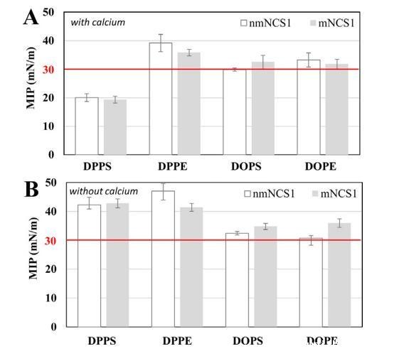 图6比较了在有钙和无钙的情况下mNCS1和nmNCS1的MIP值(数值见表S5)。在钙存在或不存在的情况下,用nmNCS1观察到的MIP值与观察到的四种磷脂的mNCS1的MIP值没有显着差异。因此,肉豆蔻酰基的存在似乎在钙存在下蛋白质的膜结合中不起关键作用。这些观察结果表明,NCS1中不存在肉豆蔻酰钙开关。事实上,另两种非肉豆蔻酰化和肉豆蔻酰化形式的NCS蛋白质VILIP-1和VILIP-3的MIP值之间的巨大差异突显了这种机制的存在[35]。在钙与DOPC/DOPS单层(3:1)的存在下观察到了这些差异。在不同的磷脂单分子膜中观察到recoverin(另一种NCS蛋白质)的MIP值存在差异,无论是否具有肉豆蔻酰化作用,这些磷脂单分子膜突出了这种蛋白质的肉豆蔻酰钙开关(C.Salese,未发表的结果)。此外,肉豆蔻酰化的存在增加了NCS1的钙协同度[24]。事实上,mNCS1与钙的结合比nmNCS1更强,3个钙离子与mNCS1结合,而nmNCS1只有2个。然而,这种区别不会导致钙存在时nmNCS1的不同膜结合。