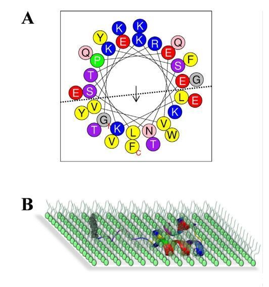 图8.(A)使用在线工具Heliquest[78]建立的N-末端肽的螺旋轮表示法。颜色代码如下:疏水残基为黄色,丝氨酸和苏氨酸为紫色,碱性残基为蓝色,酸性残基为红色,天冬酰胺和谷氨酰胺为粉红色,脯氨酸为绿色,其他残基为灰色。(B)在存在脂质单层的情况下N-末端肽的方向的图示。使用与(A)相同的颜色代码(为了解释本图例中对颜色的引用,读者请参阅本文的web版本)。