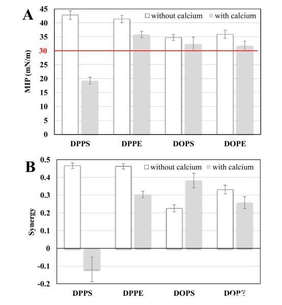 图7.在钙存在下,使用DPP、DSP、DOPS、DDPS、DPPC、DSPC、DOPC、DOPC、DDPC、DPPE、DSPE、DOPE、DOPE和DDPE的单层的N-末端肽的MIP(A)和协同作用(B)值。MIP和synergy值的不确定性如第2.3节所述计算。