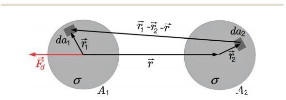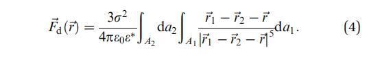 其中Ai表示域i的面积,dai表示其面积元素,-ri表示其相对于域中心的位置向量,i=1,2-r是从域1中心到域2中心的向量,如图1所示。e0是真空介电常数,ew和ea分别是水和空气的相对介电常数。在这里,我们使用了Urbakh等人21的研究结果,该研究描述了由两个半无限介质包围的薄电介质层中偶极子之间的相互作用。