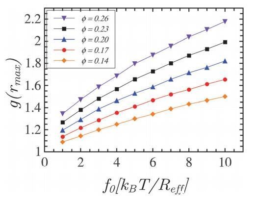 图7显示了面积分数的五个代表值的g(rmax)作为f0的函数,单位为kBT/Reff。