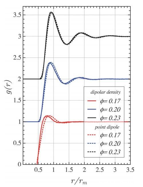 在第一个峰值位置和g(r)开始偏离零的小区域观察到轻微差异。当系统更加结构化时,协议会得到改善。特别是,对于弱相互作用域,差异开始明显。这些偏差是由于点偶极力在接触时趋于有限值,而在偶极密度情况下,它会发散。因此,硬盘相互作用与点偶极子模型有关。