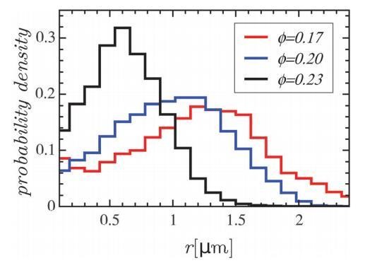 图4具有不同凝聚面积分数的单分子膜的域半径分布。